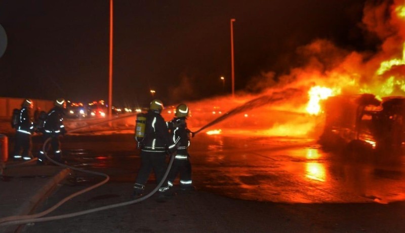 وأضاف القرني أنه على الفور جرى تحريك الفِرَق اللازمة وسيارات السلالم والمعدات المساندة، وبوصول الفِرَق للموقع، اتضح أن الحالة عبارة عن حريق بشاحنة نقل مواد بترولية (تريلا) محملة بالبنزين بحمولة (32 ألف طن) وكان الحريق نتيجة حادث مروري أدى إلى انقلابها واشتعال النار بها.