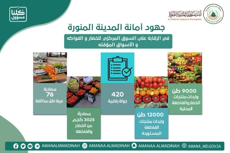 كما نفذت الفرق الرقابية أكثر من 420 جولة في الأسواق المركزية والأسواق المؤقتة، تم خلالها ضبط 3025 كيلوغراما من الخضار والفاكهة غير صالحة للاستهلاك الأدمي، وضبط ومخالفة 12 وافد، ومصادرة 76 عربة نقل مخالفة للأنظمة والاشتراطات.
