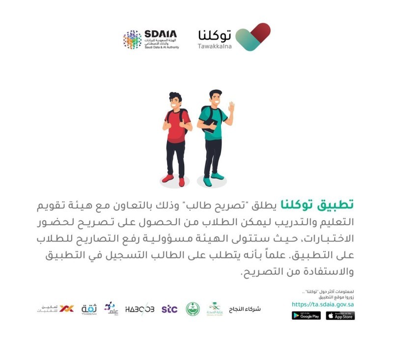 أضاف تطبيق «توكلنا» تصريح «طالب»، بالتعاون مع هيئة تقويم التعليم والتدريب، تيسيراً على الطلاب؛ حتى يتمكنوا من الحصول على التصريح لحضور وأداء الاختبارات في المقرات. وتتولى الهيئة مسؤولية رفع التصاريح عبر التطبيق للطلاب الذين يجب عليهم التسجيل في تطبيق توكلنا؛ للاستفادة من التصريح.