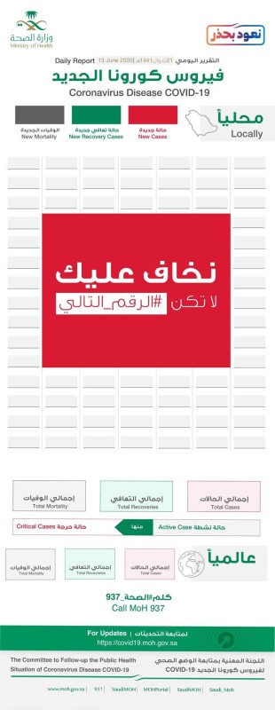 للمرة الأولى منذ بدأت جائحة كورونا، بثت وزارة الصحة اليوم (السبت)، منشور الجراف الخاص بإحصاءاتها اليومية فارغاً، غير متضمنٍ عدد الحالات، مرفقة عبارة «لا تكن أنت الرقم التالي»، في ظل تزايد الحالات يومياً في مناطق المملكة.
