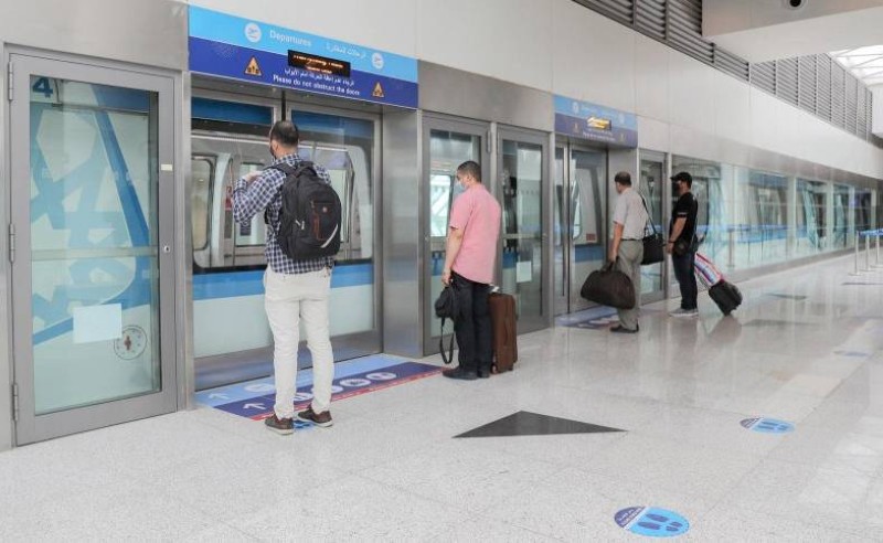مسافرون يستقلون «القطار الداخلي» لنقلهم من منطقة إنهاء الإجراءات إلى صالات السفر الدولية.