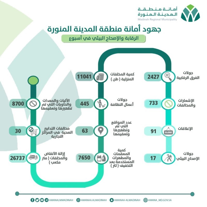 واصلت أمانة المدينة المنورة تكثيف جهودها وتنفيذ جولاتها الميدانية على الأسواق والمراكز التجارية والمنشآت الغذائية للتأكد من تطبيق الاشتراطات الصحية والتقيد بالإجراءات الوقائية والاحترازية.