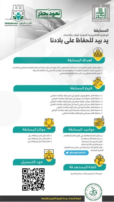 تُطلق جامعة الملك خالد، ممثلة في وحدة التوعية الفكرية وضمن مشروع «مبادرون»، المسابقة الوطنية الإلكترونية المعززة للولاء والانتماء «يدٌ بيد للحفاظ على بلادنا»، بجوائز مالية في 7 فروع، وذلك بدءًا من يوم (السبت) الموافق لـ20 ذي القعدة، ويمكن للراغبين التسجيل من خلال الرابط: ، والاطلاع على معلومات المسابقة.