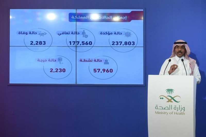ووفقا لإحصاء «الصحة» اليوم، فقد بلغ إجمالي حالات الإصابة تراكميا منذ ظهور أول حالة في المملكة 237.803 حالات، من بينها 57.960 حالة نشطة لاتزال تتلقى الرعاية الصحية اللازمة، منها 2230 حالة حرجة، فيما بلغ إجمالي حالات التعافي 177.560 حالة، في حين ارتفعت حصيلة الوفيات إلى 2283 حالة وفاة، وبذلك تصبح نسبة التعافي من إجمالي المصابين بالفايروس 74.66%، فيما بلغت نسبة الوفيات 0.96%.