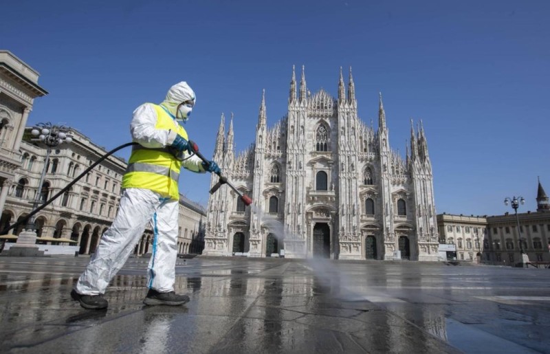 تعقيم الساحة المطلة على كاتدرائية ميلانو بإيطاليا أمس.