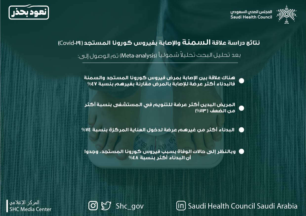 في إطار الجهود الكبيرة التي تبذلها الدولة لمواجهة فايروس كورونا، قامت الأمانة العامة للمجلس الصحي السعودي بجهود نوعية لمواجهة جائحة كورونا، وذلك عبر تعاون علمي مشترك مع البنك الدولي في دراسة عالمية مكثفه لمعرفة أثر السمنة في الإصابة بفايروس كورونا.