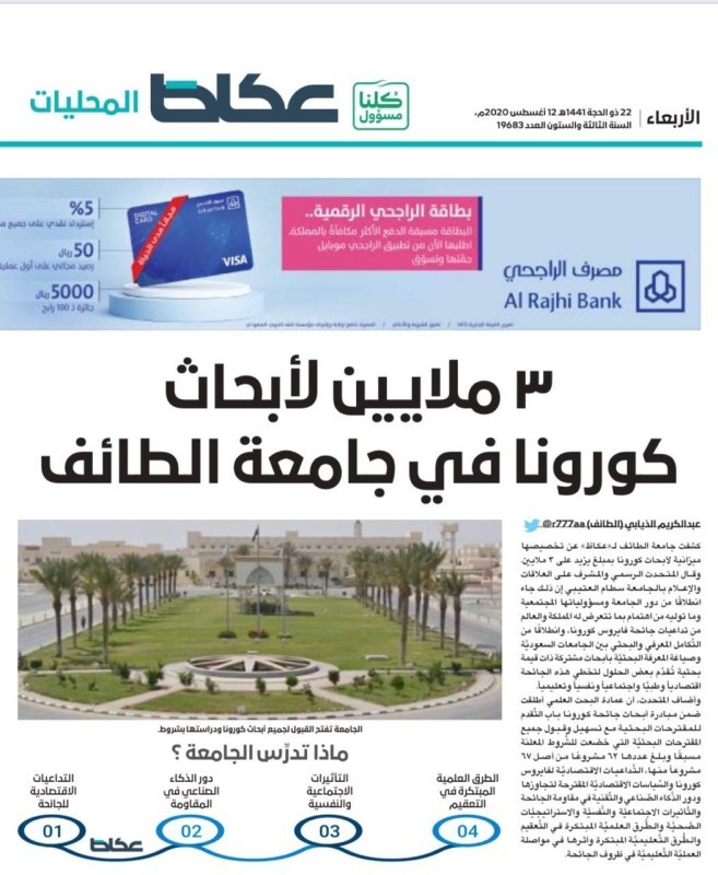 تصدّرت جامعة الملك سعود الجامعات السعودية ومؤسساتها البحثية بمشاركتها بـ40 بحثًا علميًا حول فايروس كورونا المستجد، لتصبح أبرز المساهمين في تحقيق المملكة للمركز الأول عربيًا والـ25 عالمياً في الإنتاج البحثي العلمي المتعلق بالجائحة.