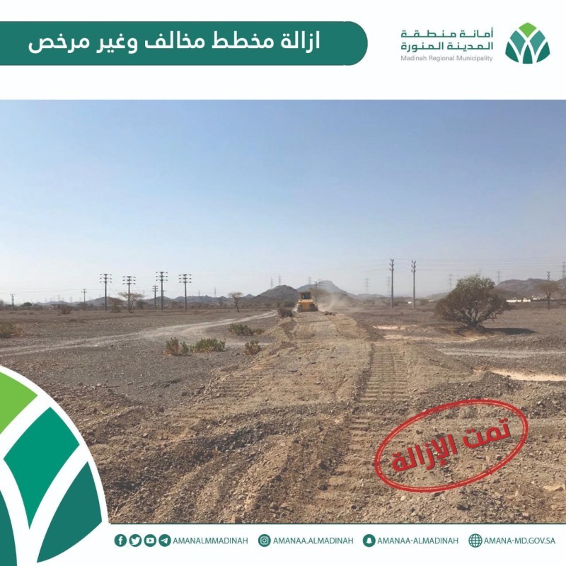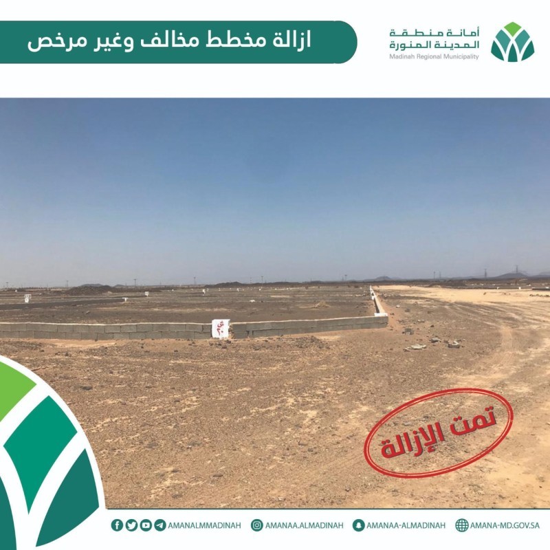 أزالت الفرق الرقابية التابعه لأمانة المدينة المنورة، بالتعاون مع الجهات الأمنية، مخططاً مخالفاً وغير مرخص بمنطقة أبيار الماشي بمساحة مليون متر مربع، إذ كان مجهزاً للبيع على المواطنين بطريقة غير نظامية، وذلك ضمن جهود الأمانة للمحافظة على الأراضي الحكومية.