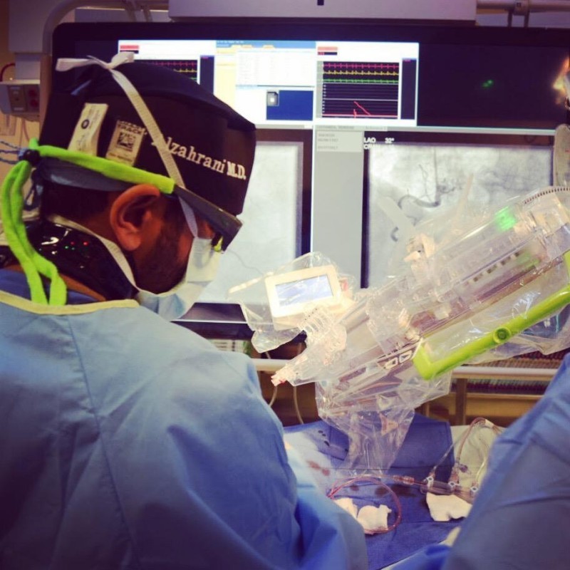 •• حصلت خلال فترة ابتعاثي للولايات المتحدة على ترخيص إجراء القسطرة القلبية باستخدام تقنية الروبوت، وهي تقنية ناشئة تتيح للممارس الطبي بيئة عمل أكثر دقة وأمانا، من خلال تقليل تعرض الطبيب للأشعة المضرة، بالإضافة إلى تقليل مخاطر إصابات الظهر، من خلال إجراء الطبيب عملية القسطرة في غرفة تحكم مخصصة لذلك، مما يزيد من دقة وسلامة وموثوقية الإجراء الطبي. ومن فوائدها كذلك دقة اختيار وتنفيذ مقاسات الدعامات القلبية خلال التدخل بالقسطرة، كما تسمح التقنية في المستقبل بإمكانية إجراء الطبيب للقسطرة القلبية من أي مكان في العالم من خلال تقنية الروبوت والتدخل عن بعد بالأقمار الصناعية.