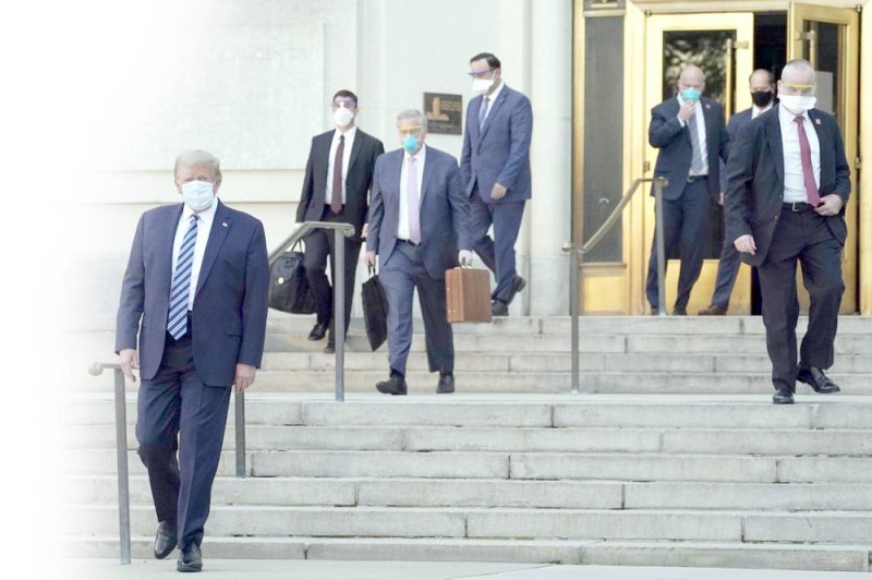 في مشهد أشبه بأفلام الإثارة الهوليوودية؛ عاد الرئيس الأمريكي دونالد ترمب الليل قبل الماضي إلى البيت الأبيض، من مركز (والتر ريد) العسكري التابع للبحرية الأمريكية، في ماريلاند، القريبة من واشنطن. وكالعادة فإن ترمب لم يتخل عن عادته إثارة الجدل. فعلى رغم إصابته المؤكدة بفايروس كورونا الجديد (كوفيد-19)؛ فقد دخل البيت الأبيض بعدما نزع كمامته؛ ما زاد المخاوف من أن يؤدي مسلكه إلى توسيع نطاق تحول البيت الأبيض إلى بؤرة تفش لوباء كوفيد-19، التي أسفرت حتى الآن عن إصابة 20 مسؤولاً أمريكياً بالفايروس؛ آخرهم السكرتيرة الصحفية للرئيس كايلي ماكيناني، التي أكدت إصابتها أمس الأول. واضطر مسؤولو البيت الأبيض إلى الاستعانة بعمال يرتدون زي مقاومة المواد الخطرة (هازموت) لتطهير مكاتب وقاعات الجناح الغربي من البيت الأبيض. ولا يعرف هل سيذهب ترمب إلى المكتب البيضاوي أم أنه سيكتفي بالعزل في الجناح الطبي هناك. وأثار ترمب عاصفة من الغضب بتصريحه، وهو يغادر المستشفى، الذي طلب فيه من الأمريكيين ألا يخافوا من الفايروس، الذي قتل حتى الآن أكثر من 215 ألف أمريكي. وأكد ترمب بعد وصوله إلى البيت الأبيض أنه في حال صحية حسنة. وكان طبيبه الخاص الدكتور شون كونلي أكد -ليل الإثنين- أن ترمب «لا يزال حاملاً لفايروس مُعدٍ، وأنه لم يُشف تماماً، وأن ذلك الوضع قد يستمر أسبوعاً آخر». وقال ترمب، في مقطع فيديو قبيل خروجه من المستشفى، إنه يعتقد أنه «بات يملك مناعة ضد الفايروس»! وكان واضحاً أن ترمب يريد بأية حال استئناف حملته الانتخابية، خصوصاً أنه لم يبق سوى أقل من 30 يوماً على الانتخابات الرئاسية. وذكرت وكالة (أسوشيتد برس) أمس، نقلاً عن مصادر في البيت الأبيض، أن كبار مسؤولي الإدارة سارعوا -إزاء إصرار الرئيس على مغادرة المستشفى- إلى إحداث تغييرات في غرفتي الخرائط واستقبال الدبلوماسيين لتكونا مكتباً لترمب أثناء فترة تعافيه، ولقطع الطريق على أي محاولة منه للعمل من المكتب البيضاوي. وفيما حاول ترمب التظاهر بأنه أقوى من كوفيد-19، وأنه شخص لا تمكن هزيمته؛ فإن طبيبه الدكتور كونلي أقرّ، أمام الصحفيين مساء الإثنين، بأن إصابة الرئيس قد تتدهور إلى الأسوأ، لذلك فإن فريقه الطبي سيوفر له رعاية طبية على مدار ساعات اليوم، إلى حين شفائه. ورفض كونلي وزملاؤه الإجابة على أسئلة خبراء عما إذا كان الدواء الهرموني المضاد للالتهابات (ديكساميثاسون)، الذي يتعاطاه ترمب، قد أدى إلى تغيير مزاجه، وطريقة تفكيره. وأوضح كونلي أن ترمب بقيت له جرعة وحيدة من عقار ريمديسفير المضاد للفايروسات، ستُعطى له في البيت الأبيض. وذكرت شبكة (سي إن إن) أمس أن خبراء الإدارة الأمريكية نصحوا ترمب بالبقاء في المستشفى العسكري، التزاماً بالإرشادات التي حددها المركز الأمريكي للحد من الأمراض. وأشاروا إلى أنه يتناول الدواء الهرموني المضاد للالتهابات الذي يقوم عملياً بكبح المناعة، فيما يتناول في الوقت نفسه عقاقير أخرى تحض جهاز المناعة على إشهار أسلحته بوجه الفايروس الغازي. وهو أمر يتطلب متابعة طبية مستمرة. لكنه تمسك بضرورة عودته للبيت الأبيض.