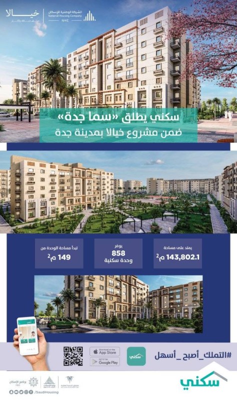 أطلقت الشركة الوطنية للإسكان، مشروع «سما جدة» ضمن مشاريع «خيالا» بحي الحمدانية شمال محافظة جدة (أحد المشاريع السكنية تحت الإنشاء التي تنفذها الشركة بالتعاون مع مطورين فرعيين)، ويمكن للأسر الراغبة في حجز ومعاينة الوحدات زيارة مركز سكني الشامل بمحافظة جدة، أو عبر منصة وتطبيق «سكني» من خلال الرابط