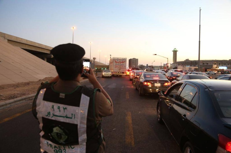 رجل مرور يوثق آلياً سيارة مخالفة بأحد شوارع جدة أمس. (تصوير: مديني عسيري)