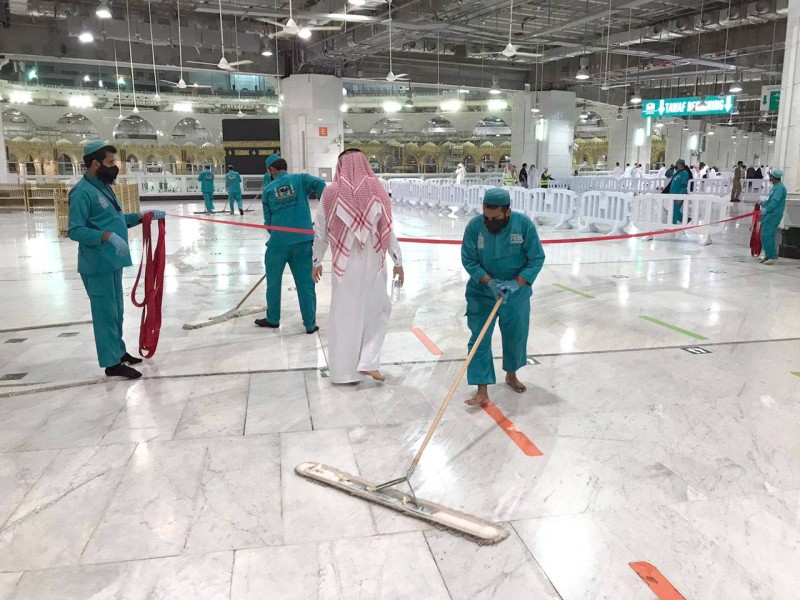 وبمجرد انتهاء الصلوات يهرع عاملو النظافة بمعداتهم اليدوية والآليات الكهربائية المزودة بالمواد المطهرة لتنظيف صحن المطاف والمصليات في كافة الأدوار وكافة المداخل والمخارج كما أعادت الرئاسة العامة لشؤون المسجد الحرام والمسجد النبوي وضع خطوط وملصقات أرضية ومسارات خاصة للدخول والخروج بعد بدء المرحلة الثالثة لتواكب زيادة الأعداد المتوقعة مع المحافظة على التباعد الاجتماعي، فيما ينتشر رجال الأمن في كافة أرجاء المسجد الحرام والمداخل للتأكد من تطبيق التباعد الاجتماعي وتنظيم عملية الدخول والخروج وإدارة الحشود البشرية والمحافظة على أمن وراحة الضيوف على مدار الساعة. وتتواجد الكاميرات الحرارية في كافة أبواب الحرم المخصصة للدخول ويتم من خلالها معرفة حرارة الجسم قبل الوصول للمدخل بعدة أمتار حفاظا على الصحة العامة. فيما خصصت مواقع خاصة وضعت فيها كمامات طبية ومعقمات لليدين على مدار الساعة مع تخصيص موظفين لتوعية زوار الحرم كما خصصت الرئاسة دور الميزانين بالدور الأول للطواف والسعي بالعربات، ويمكن الوصول إليها من 4 مداخل للمسجد الحرام إذ تم توفير أكثر من (٥٠٠٠) عربة عادية وقرابة (٣٠٠٠) عربة كهربائية لمحتاجيها من المعتمرين وقاصدي المسجد الحرام، من كبار السن والمرضى والأشخاص ذوي الإعاقة.