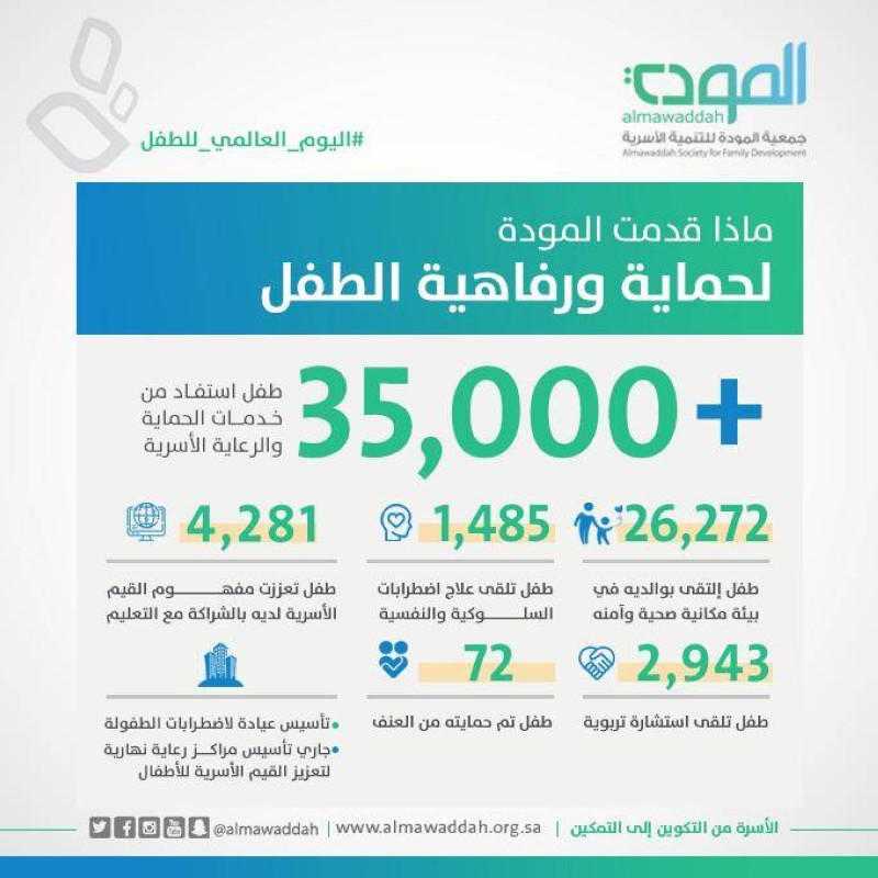 أوضح مدير عام جمعية المودة للتنمية المستدامة بمنطقة مكة المكرمة محمد آل رضي أن 35.053 طفلا استفادوا من خدمات الجمعية منذ العام 2016، وذلك عبر عدة مبادرات تنموية مستدامة متنوعة ما بين خدمات علاج الاضطرابات السلوكية والنفسية والحماية من العنف وتعزيز القيم الأسرية لديهم والاستشارات التربوية لأسرهم.