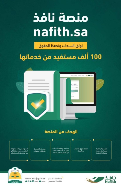 استطاعت منصة «نافذ» nafith.sa التابعة لوزارة العدل؛ خدمة العديد من الأفراد والمنشآت من خلال خدمات إنشاء وحفظ وإدارة سندات التنفيذ إلكترونيًا، بعد أن استفاد منها نحو 100 ألف مستفيد.