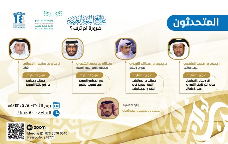 نظمت الإدارة العامة للتعليم بجدة مساء أمس (الثلاثاء) أمسية ثقافية بعنوان «اللغة العربية جمال اللغة وقوة التأثير»، بمشاركة عدد من الأدباء والكتاب والشعراء، والتي جاءت ضمن فعاليات الإدارة للاحتفال باليوم العالمي للغة العربية عبر برنامج ZOOM.