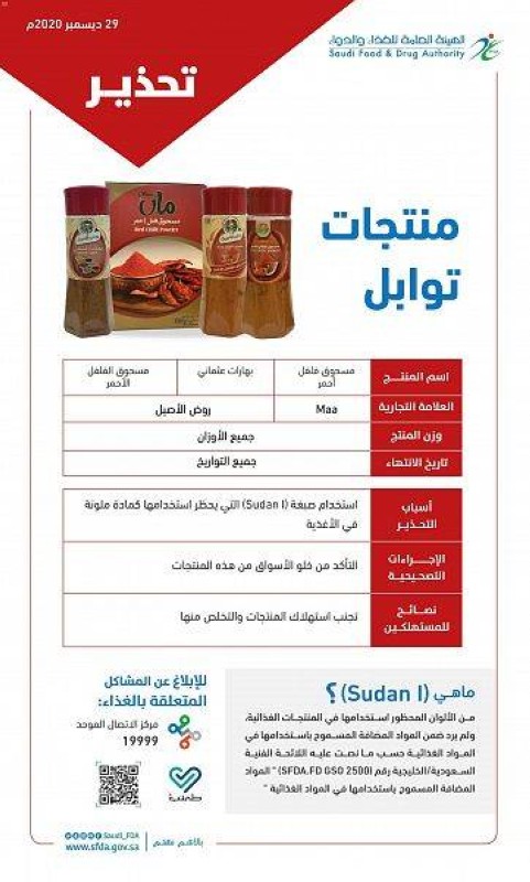 حذّرت الهيئة العامة للغذاء والدواء من ثلاثة منتجات توابل، بسبب احتوائها على صبغة (Sudan I) المحظور استخدامها في المنتجات الغذائية لاحتمالية تأثيرها على صحة المستهلك.