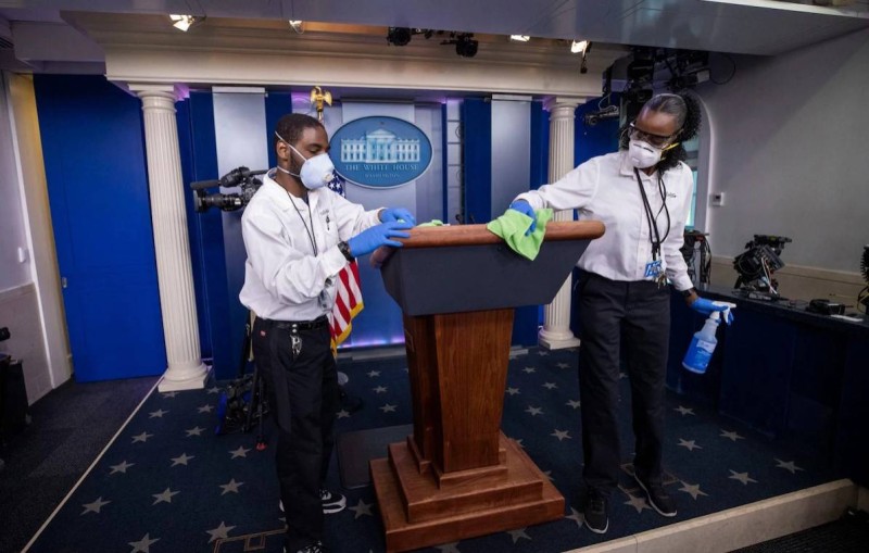 عاملان يقومان بتعقيم غرفة المؤتمرات الصحفية بالبيت الأبيض.