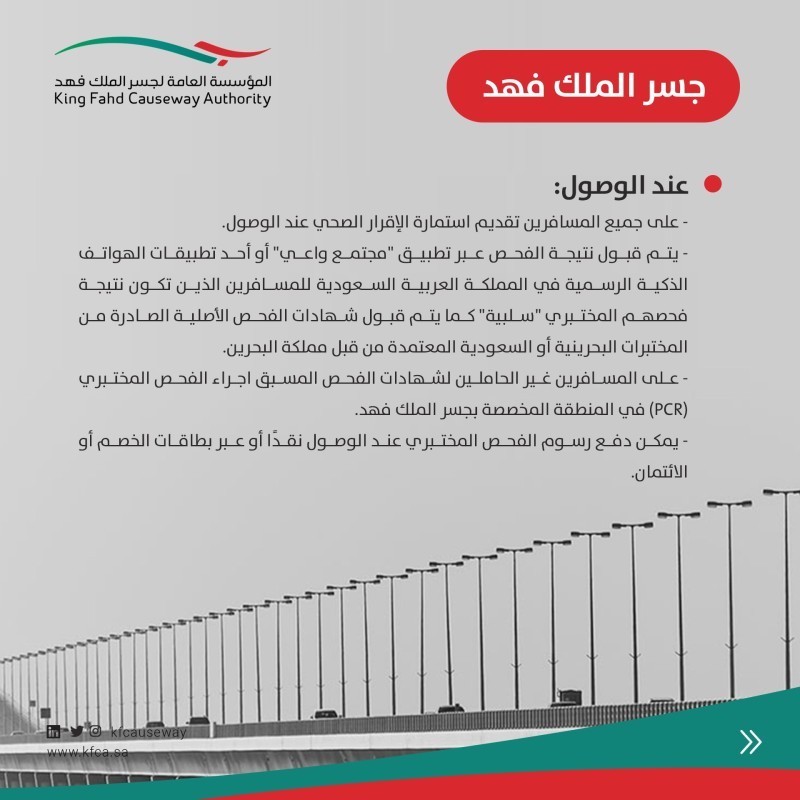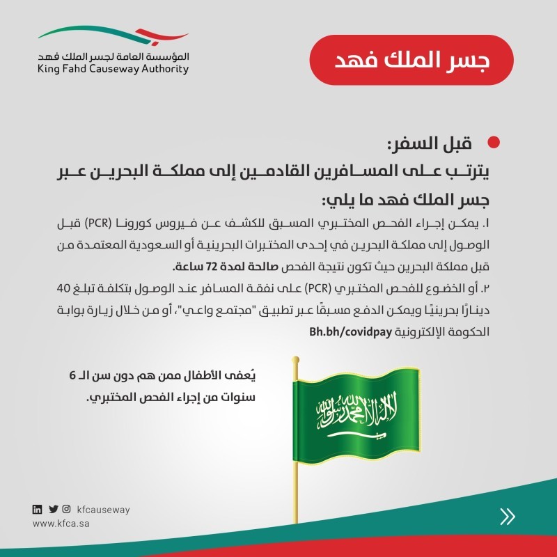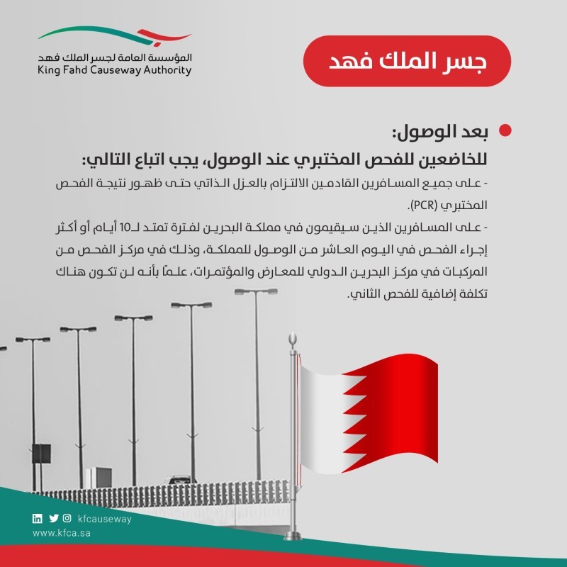 وكانت المؤسسة العامة لجسر الملك فهد أكدت على أهمية التقيد بالتعليمات بشأن الإجراءات الصحية المتبعة لدخول مملكة البحرين للمواطنين البحرينيين والمسافرين المصرّح لهم، إذ أكدت ضرورة إجراء الفحص المختبري المسبق للكشف عن فايروس كورونا (PCR) قبل الوصول إلى مملكة البحرين في أحد المختبرات البحرينية أو السعودية المعتمدة من قبل البحرين حيث تكون نتيجة الفحص صالحة لمدة 72 ساعة، أو الخضوع للفحص المختبري (PCR) على نفقة المسافر عند الوصول بتكلفة تبلغ 400 ريال سعودي.