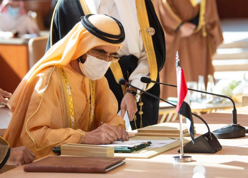 وتابع: «وإننا لننظر ببالغ الشكر والتقدير لجهود رأب الصدع التي سبق أن قادها صاحب السمو الشيخ صباح الأحمد ـ رحمه الله ـ واستمر بمتابعتها الشيخ نواف الأحمد. كما نشيد في هذا الشأن بمساعي الولايات المتحدة الأمريكية الصديقة، وجميع الأطراف التي أسهمت بهذا الشأن، حيث أدت هذه الجهود بحمد الله ثم بتعاون الجميع، للوصول إلى اتفاق بيان العلا الذي سيتم توقيعه في هذه القمة المباركة، والذي جرى التأكيد فيه على التضامن والاستقرار الخليجي والعربي والإسلامي، وتعزيز أواصر الود والتآخي بين دولنا وشعوبنا، بما يخدم آمالها وتطلعاتها». وأردف: «نحن اليوم أحوج ما نكون لتوحيد جهودنا للنهوض بمنطقتنا ومواجهة التحديات التي تحيط بنا، وخاصة التهديدات التي يمثلها البرنامج النووي للنظام الإيراني وبرنامجه للصواريخ البالستية ومشاريعه التخريبية الهدامة التي يتبناها ووكلاؤه من أنشطة إرهابية وطائفية هدفها زعزعة الأمن والاستقرار في المنطقة، مما يضعنا أمام مسؤولية دعوة المجتمع الدولي للعمل بشكل جدي لوقف تلك البرامج والمشاريع المهددة للسلم والأمن الإقليمي والدولي».