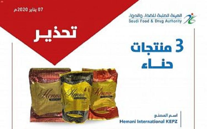 حذّرت الهيئة العامة للغذاء والدواء من ثلاثة منتجات من الحناء بسبب احتوائها على نسبة عالية من البكتيريا والفطريات تجاوزت الحد الأقصى المسموح به.