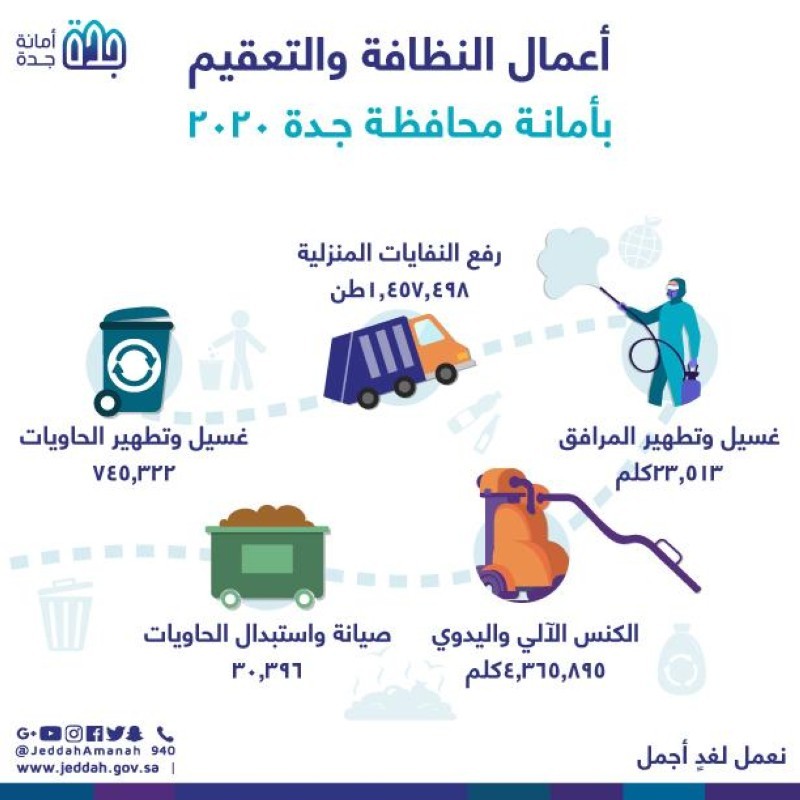 أسفرت جهود أمانة محافظة جدة في خدمات النظافة عن رفع وترحيل أكثر من 1457000 طن من النفايات المنزلية خلال عام 2020، وذلك ضمن الخطط التشغيلية لأعمال النظافة في نطاق 19 بلدية فرعية وفي إطار جهود الأمانة الهادفة إلى رفع مستوى الإصحاح البيئي في المحافظة.