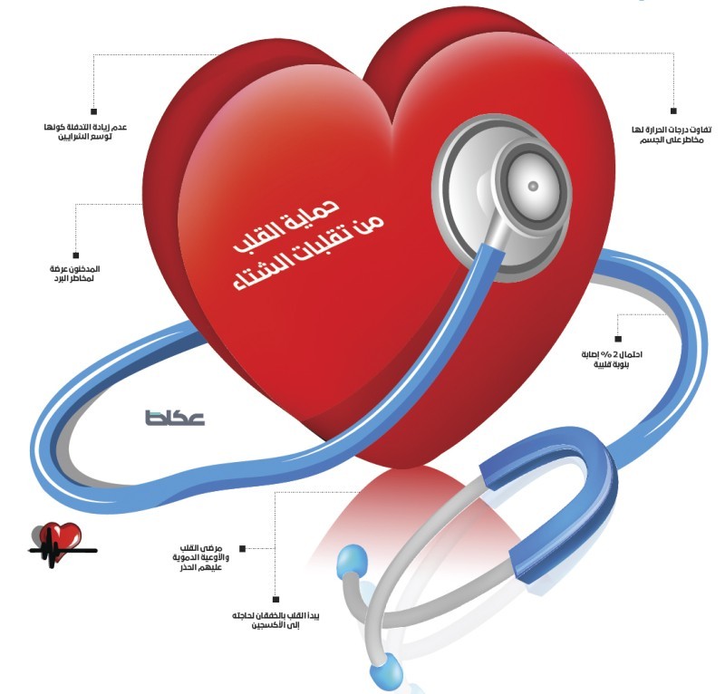 قدّر مختصون في القلب نسبة زيادة الأزمات القلبية في الشتاء بـ15 % مع تفاوت درجات الحرارة، فعندما تنخفض درجة الحرارة درجة واحدة، تزداد مخاطر الإصابة بنوبة قلبية 2 %، لذا يجب حماية القلب من انخفاض درجات الحرارة في الشتاء.
