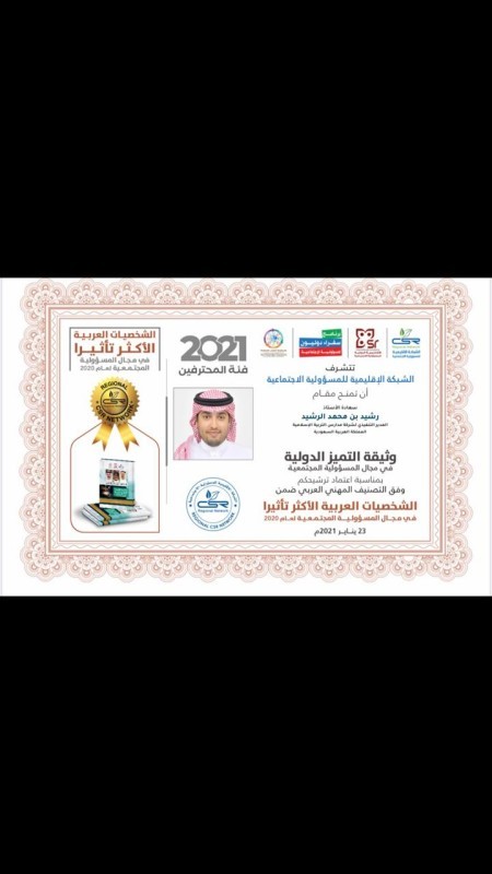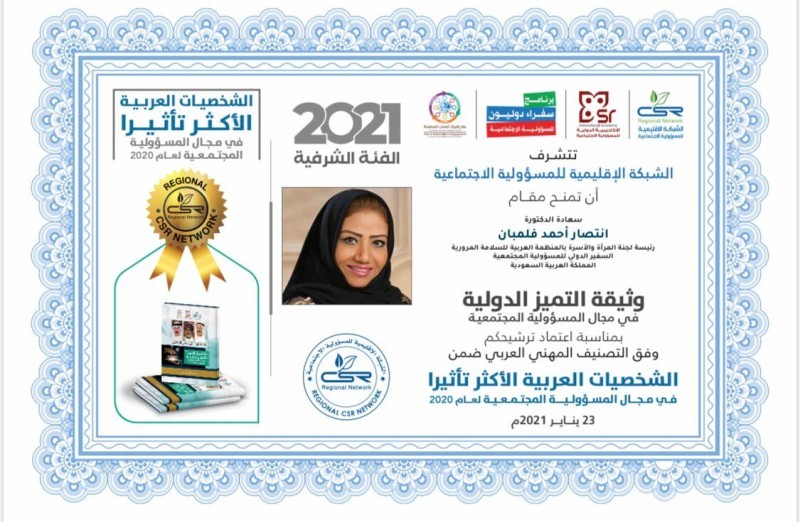 وسجلت أكثر من 100 شخصية عربية الأكثر تأثيراً في المسؤولية المجتمعية لعام 2020 من ضمنهم، الفئة الشرفية عبداللطيف الفوزان صاحب المبادرات والمهتم بالأعمال التطوعية والخيرية، رشيد محمد الرشيد، والسفير الدولي للمسؤولية الاجتماعية الدكتورة انتصار فلمبان التي تم اختيارها للمرة الثانية على التوالي، والأميرة هند بنت عبدالرحمن، والدكتورة زينب أبوطالب عضو مجلس الشورى.