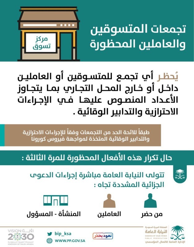 ونوهت النيابة إلى أنه في حال تكرار هذه السلوكيات المخالفة للمرة الثالثة فإنها ستتولى مباشرة إجراءات الدعوى الجزائية المشددة تجاه من حضر للتسوّق والعاملين والمنشأة/المسؤول.
