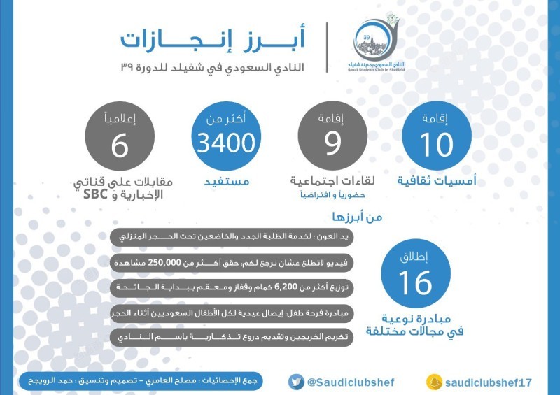 نجح النادي السعودي في مدينة شفيلد بالمملكة المتحدة خلال دورته الـ39 في إطلاق أكثر من 16 مبادرة تطوعية في مجالات مختلفة وإقامة 19 لقاء اجتماعيا وثقافيا استفاد منها أكثر من 3400 شخص.
