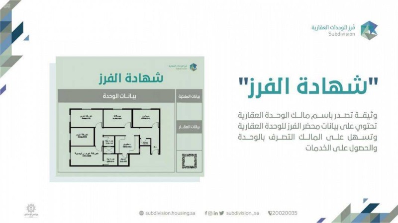 وأوضح البرنامج أن «شهادة الفرز» عبارة عن وثيقة إلكترونية رسمية تصدر باسم مالك الوحدة العقارية المفرزة لتوضح بيانات الوحدة العقارية بعد إصدار صك ملكية مستقل للعقار، إذ يمكن الحصول عليها في أي وقت عن طريق برنامج «فرز الوحدات» لتسهّل على مالك الوحدة التصرف بها في حال البيع والشراء أو التأجير، كما تمكّنه من الحصول على الخدمات التي تقدمها الجهات الخدمية والتمويلية، التي يتطلب الحصول على الشهادة لمعرفة مخطط الوحدة العقارية المفرزة وبياناتها.