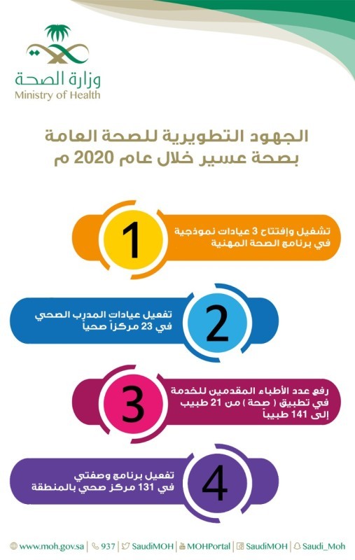 أوضحت صحة عسير، أنه تم تفعيل عيادات الصحة المهنية بكامل التجهيزات في جميع المنشآت الصحية بالقطاع الحكومي والخاص، كما تم تشغيل وافتتاح 3 عيادات نموذجية في برنامج الصحة المهنية بكامل التجهيزات، والمعايير المعتمدة خلال عام 2020.