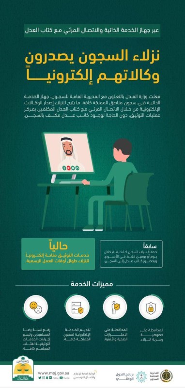 وتتيح الخدمة لنزلاء السجون إصدار الوكالات الإلكترونية من خلال الاتصال المرئي عن بُعد مع كُتّاب العدل المكلفين بمركز عمليات التوثيق، دون الحاجة لوجود كاتب عدل مُكلف بالسجن.