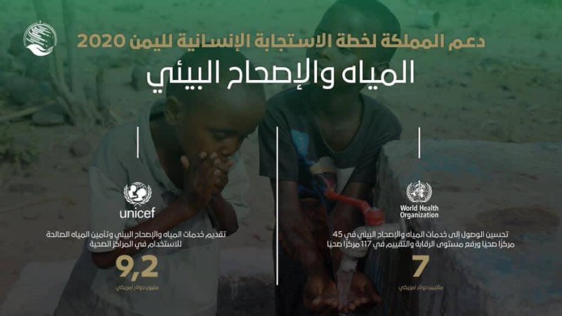 نفذ مركز الملك سلمان للإغاثة والأعمال الإنسانية ضمن منحة المملكة لخطة الاستجابة الإنسانية لليمن 2020، العديد من المشاريع الإنسانية والإغاثية في خدمات المياه والإصحاح البيئي.