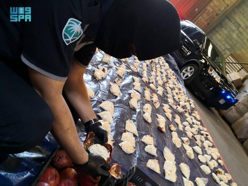 وفي السياق، تمكنت الجمارك السعودية في ميناء جدة الإسلامي من إحباط محاولة تهريب كمية كبيرة من حبوب الكبتاجون بلغت أكثر (5.3) مليون حبة، مُخبأة ضمن إرسالية فاكهة رمان.