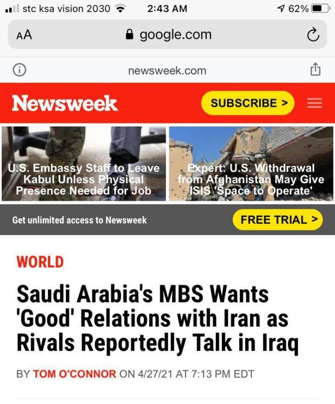 من جانبها، أوردت صحيفة «نيوز ويك» الأمريكية ما صرح به الأمير محمد بن سلمان أن المملكة لن تقبل أي تدخل في شؤونها الداخلية، والسعودية تريد علاقات جيدة مع إيران وتعمل مع شركاء إقليميين ودوليين لإيجاد حلول لـ«السلوك السلبي» لطهران.