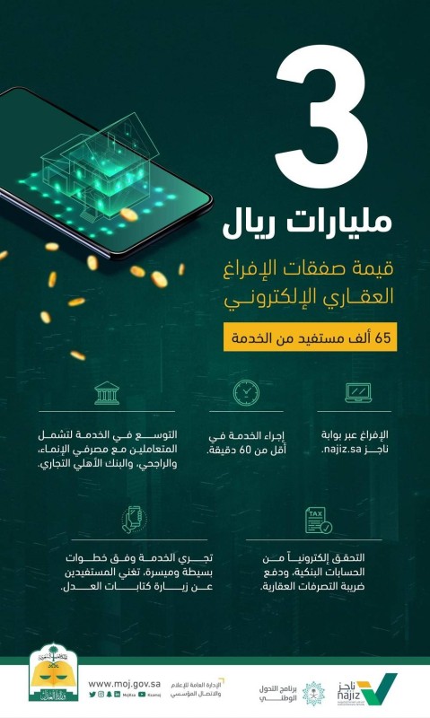 وأضحت الوزارة أن خدمة الإفراغ العقاري الإلكتروني عبر بوابة ناجز Najiz.sa، مكنت المستفيدين من بيع ونقل الملكية العقارية بالكامل دون الحاجة إلى زيارة كتابات العدل والبنوك لإصدار شيك مصدق بالمبايعة.