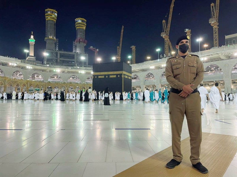 وهناك مجموعة تنتشر في أنحاء المطاف للتعامل مع المعتمرين الذين انتهوا من أشواطهم السبعة يوجهونهم نحو الأماكن المخصصة لأداء الصلاة ويحاولون جاهدين أن لا يكون في المطاف أي افتراش أو تجاوز لأي احترازات أو إجراءات معينة، هنا أحدهم قرب الحجر الأسود يتصفح المكان بنظراته وابتسامته التي تنبئك عن مدى فخره وسعادته بالعمل في هذا المكان وزميله يقف عند مقام إبراهيم يساعد في تنظيم الطائفين، والثالث يأخذ بيد سيدة عجوز ليخرجها من المسار المخصص للطواف بعد أن انتهت من منسكها.