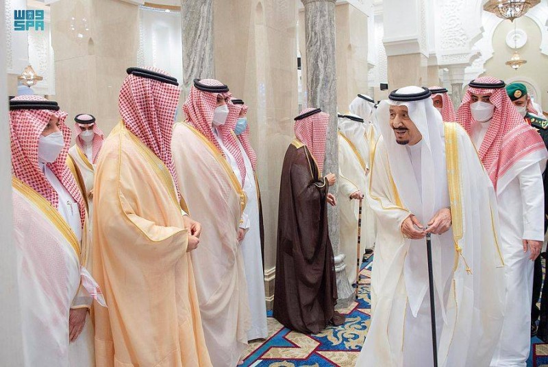 وعقب الصلاة، تلقى خادم الحرمين الشريفين التهاني والتبريكات من أصحاب السمو والمعالي بالعيد السعيد.