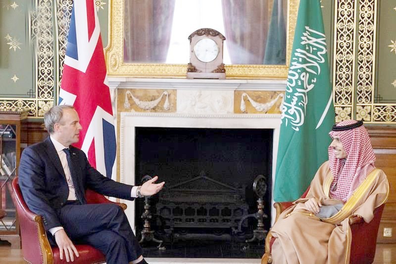 وزير الخارجية الأمير فيصل بن فرحان، خلال لقائه وزير الخارجية البريطاني دومينك راب أمس.