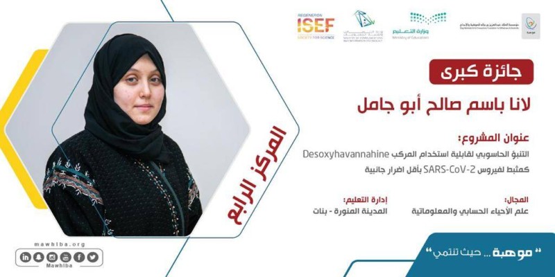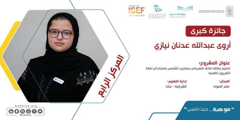 وحقق الجوائز الكبرى كل من: الطالب منصور المرزوقي بفوزه بالمركز الثاني في مجال الطاقة: المواد والتصميم المستدام عن مشروعه «تصميم مكثف كهربائي فائق يشحن نفسه بوسيلة الضوء»، والطالبة رشا القحطاني حصدت جائزة المركز الثالث في مجال العلوم الاجتماعية والسلوكية عن مشروعها «خاصية لعبة فيديو مبتكرة للتشخيص النفسي لاضطراب القلق العام في مرحلة المراهقة»، والطالبة لانا أبو جامل حققت المركز الرابع في مجال علم الأحياء الحسابي والمعلوماتي عن مشروعها «التنبؤ الحاسوبي لقابلية استخدام مركب خاص كمثبط لفايروس SARS-CoV-2 بأقل أضرار جانبية»، والطالب عبدالله الشنقيطى فاز بجائزة المركز الرابع في مجال الطاقة: المواد والتصميم المستدام عن مشروعه «قطب كهربائي من النيكل كوبالتايت لإنتاج وقود الهيدروجين بسعر منخفض وطريقة متجددة»، والطالبة أروى نيازي بجائزة المركز الرابع في مجال علم المواد عن مشروعها تصنيع مكثف فائق يستجيب للشمس باستخدام نقاط الكربون الكمية.
