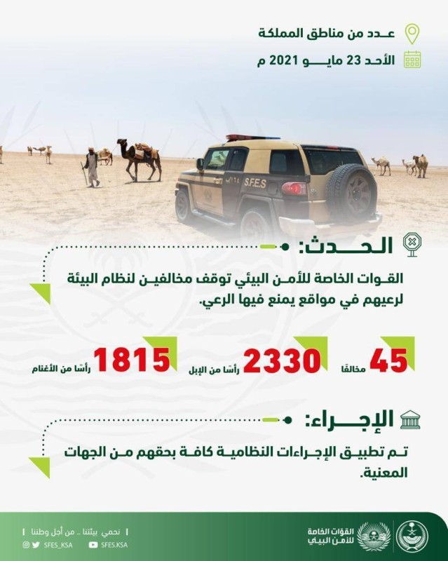 أوقفت القوات الخاصة للأمن البيئي 45 مخالفاً لنظام البيئة، منهم 32 مواطناً و13 مقيماً من الجنسيات السودانية والصومالية والهندية، ارتكبوا مخالفات رعي 2330 رأساً من الإبل و1815 رأساً من الأغنام في أماكن يمنع فيها الرعي في عدد من مناطق المملكة.