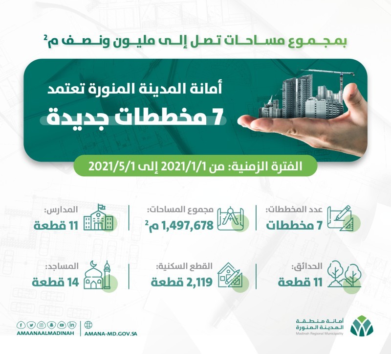 اعتمدت أمانة منطقة المدينة المنورة 7 مخططات في الربع الأول من عام 2021، بمجموع مساحات بلغت مليونا و497 ألفا و678 مترا مربعا. ويأتي اعتماد المخططات التي تضمنت 2119 قطعة سكنية، و11 قطعة مخصصة للحدائق، و11 للمدارس، و14 قطعة للمساجد، في إطار جهود الأمانة لتطوير البنية التحية ورفع مستوى جودة الحياة في المنطقة، وذلك بعد التأكد من موافقة المخططات المعتمدة للمعايير والاشتراطات التخطيطية الخاصة بالأمانة، لتتلاءم المخططات السكنية الجديدة مع التطورات البيئية والاقتصادية بالمنطقة، والتي من شأنها أن تسهم في تغطية الطلب على الوحدات السكنية، في ظل النمو الذي تشهده المنطقة على جميع الأصعدة.