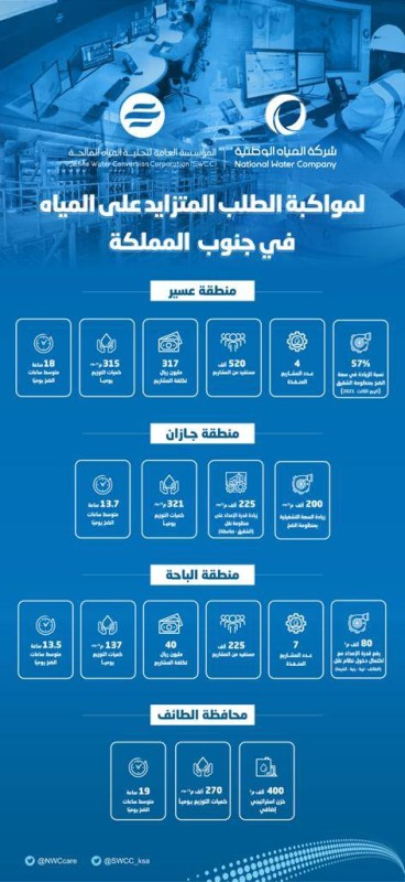 من جهتها، أوضحت «المياه الوطنية» أن كميات التوزيع اليومية في منطقة جازان خلال فصل الصيف للعام الحالي ستصل إلى 321 ألف متر مكعب يومياً وتشمل الكميات الواردة من المؤسسة العامة لتحلية المياه المالحة، ومحطات تنقية مياه السدود والآبار الجوفية التي تقوم المياه الوطنية بتشغيلها في المنطقة، ليصل متوسط ساعات الضخ اليومية إلى 13.7 ساعة يومياً للأحياء المخدومة بالشبكات.
