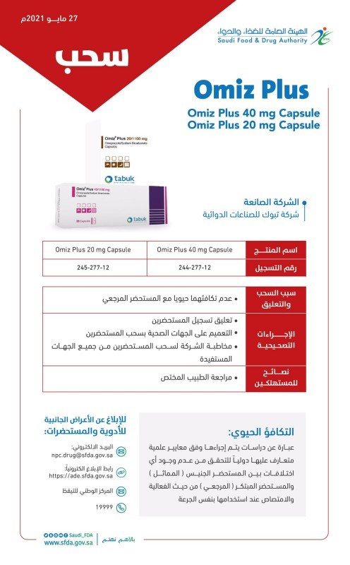 أصدرت الهيئة العامة للغذاء والدواء قراراً بتعليق تسجيل وسحب مستحضري Omiz Plus 40/1100 mg Capsule المسجل بالهيئة برقم تسجيل (244-277-12)، وOmiz Plus 20/1100 mg Capsule برقم التسجيل (245-277-12).