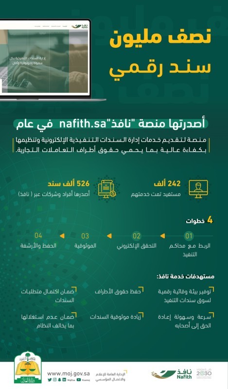 أصدرت منصة «نافذ» التابعة لوزارة العدل منذ إطلاقها قبل نحو عام ما يزيد على نصف مليون سند، عبر خدمة نحو ربع مليون مستفيد من الأفراد والمنشآت، الذين تمكنوا من إنشاء وحفظ وإدارة سندات التنفيذ إلكترونياً.