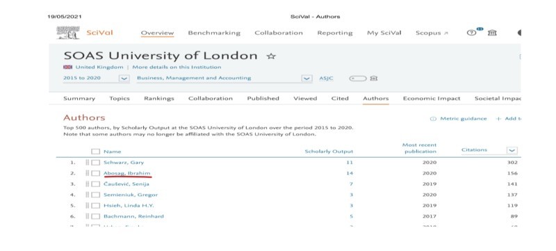 حل الأكاديمي السعودي الدكتور إبراهيم أبو ساق في المركز الأول على مستوى كلية سواس بجامعة لندن لتخصصات إدارة الأعمال والتجارة والمحاسبة، من حيث قوة التأثير للبحوث المنشورة، استنادا إلى نتائج شركة السيفير (Elsevier) المتخصصة في التحليل والنشر للتخصصات العلمية والأكاديمية.