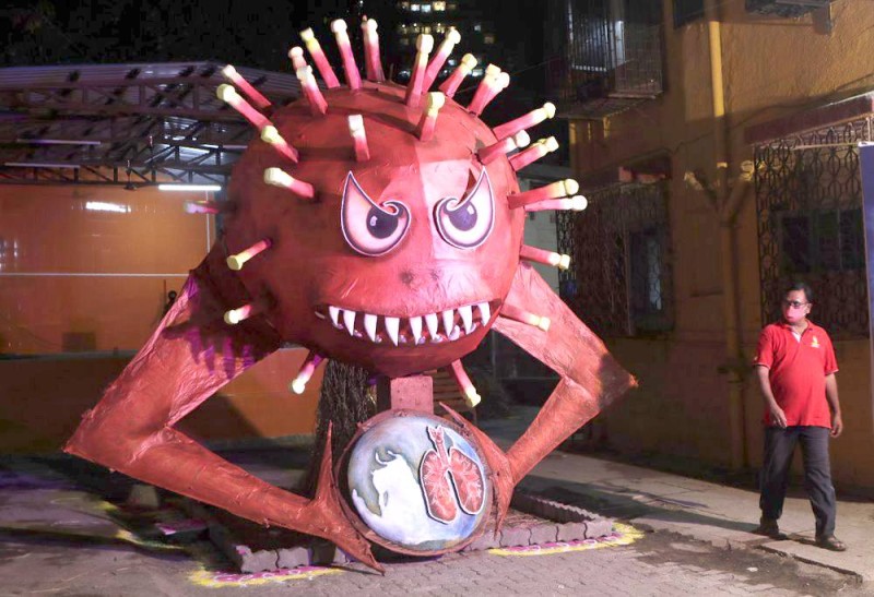 دمية لفايروس كوفيد-19 في أحد شوارع مومباي. (وكالات)