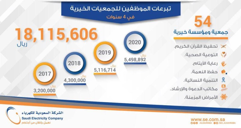 وبينت «السعودية للكهرباء»، أن مجموع تبرعات الموظفين بلغ أكثر من 18 مليون ريال على مدى 4 سنوات، ففي 2017 بلغ مجموع التبرعات 3,200,000 ريال، وفي 2018 بلغت التبرعات 4,300,000 ريال، وفي 2019 بلغت 5,116,714 ريالاً، وفي 2020 بلغت 5,498,892 ريالاً، مشيرة إلى أن هذه التبرعات لدعم 54 جمعية خيرية ومجتمعية على مستوى المملكة، في عدد من المجالات مثل تحفيظ القرآن الكريم، التوعية الصحية، رعاية الأيتام، حفظ النعمة، التنمية النسائية، مكاتب الدعوة والإرشاد، والأمراض المزمنة وغير ذلك من الجمعيات العاملة في المجالات المجتمعية والخيرية المهمة داخل مدن المملكة.