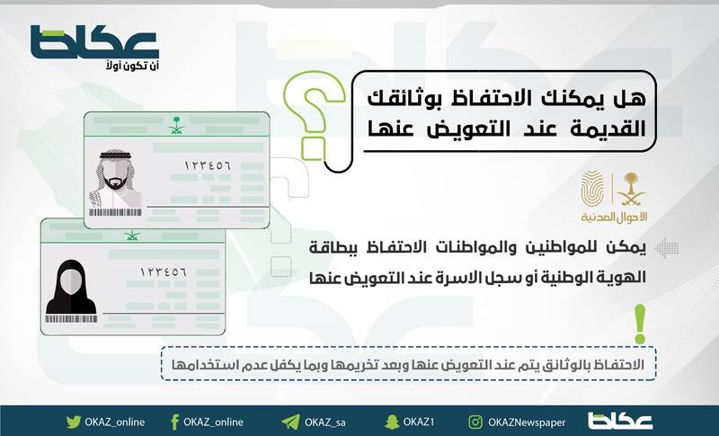 أعلنت وكالة وزارة الداخلية للأحوال المدنية بأنه يمكن للمواطنين والمواطنات الاحتفاظ ببطاقة الهوية الوطنية أو سجل الأسرة عند التعويض عنها، وبعد تخريمها وبما يكفل عدم استخدامها.